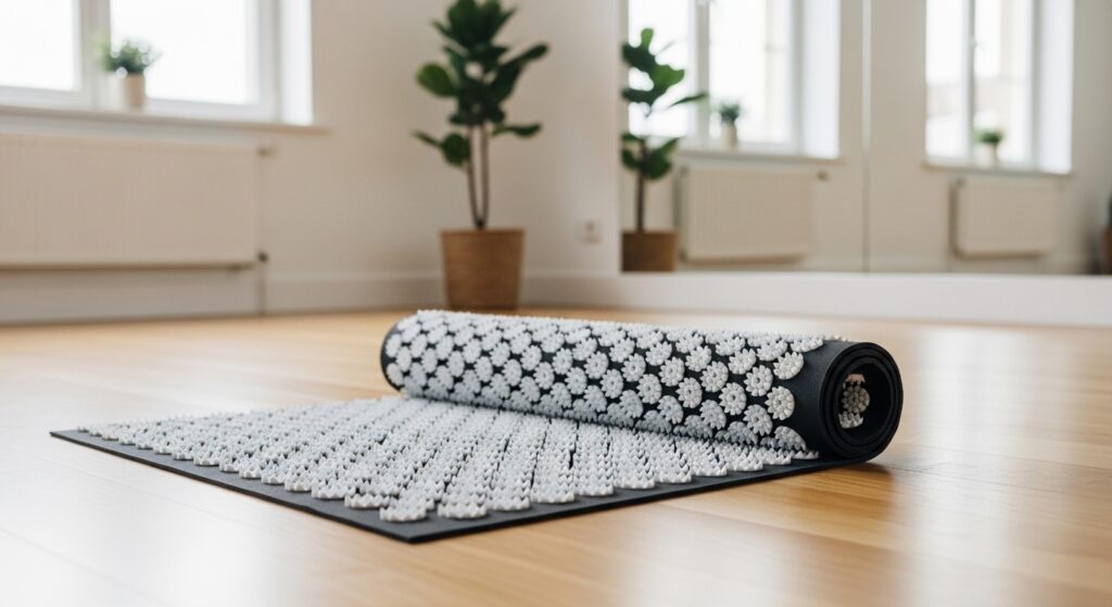 指圧マットは、マット表面に無数の突起がついており、その上に寝転ぶだけで全身のツボを刺激できる健康グッズです。別名「鍼マット」「ヨガマット」「アキュプレッシャーマット」とも呼ばれます。